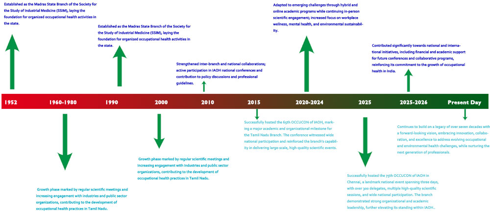The Tamil Nadu Branch has a rich legacy dating back to 1952, when it was established as the Madras State Branch of the Society for the Study of Industrial Medicine (SSIM). Over the decades, the branch has evolved in line with the changing industrial and occupational health landscape, responding proactively to emerging challenges and opportunities.